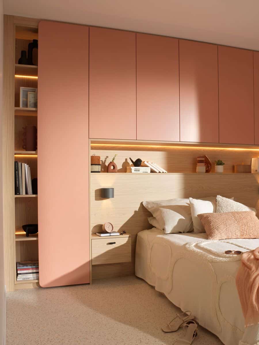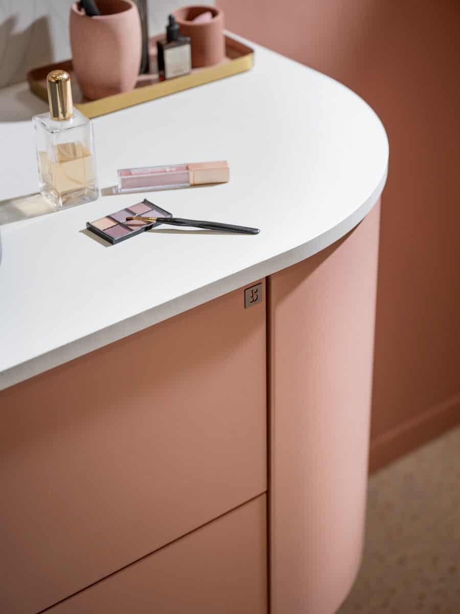 En effet, les meubles aux façades arrondies, caractéristiques du concept Curve, transforment non seulement les cuisines, mais aussi les salons, les salles de bains et même les espaces de rangement comme les dressings ou les bibliothèques. Les lignes courbes adoucissent l’espace en éliminant les angles droits souvent perçus comme rigides. Ce design contribue à une circulation plus fluide et à une transition naturelle entre les différentes zones de la maison.