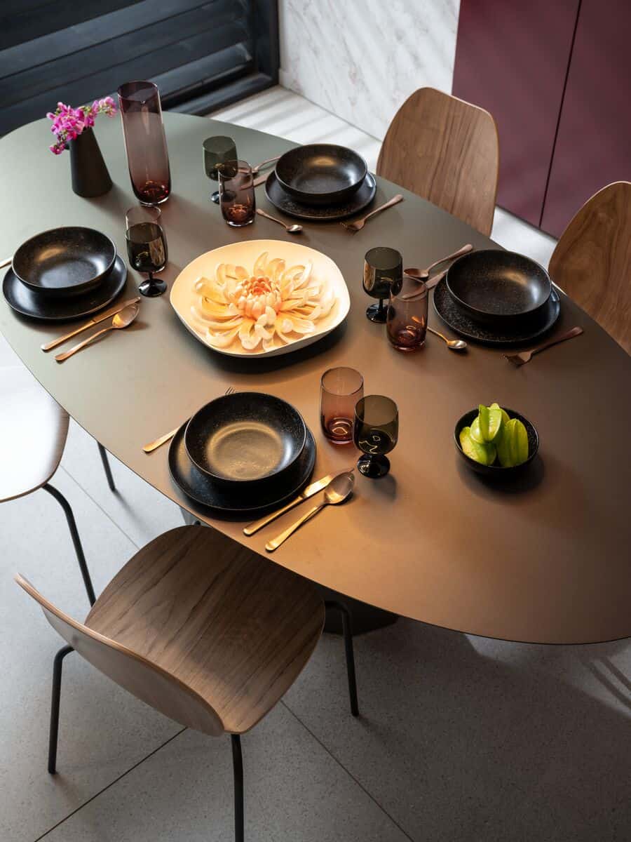 Les objets décoratifs aux formes arrondies, comme la chaise Tyra ou la table à manger ovale Ankara en acier s’intègrent parfaitement à cet univers. Les textiles jouent également un rôle clé : des rideaux en lin aux plis fluides, des tapis circulaires ou des coussins aux motifs organiques peuvent renforcer la sensation de confort et d’équilibre. Côté matières, privilégier les surfaces satinées ou encore les finitions mates apporte une sensation de douceur tout en mettant en valeur les courbes des meubles.